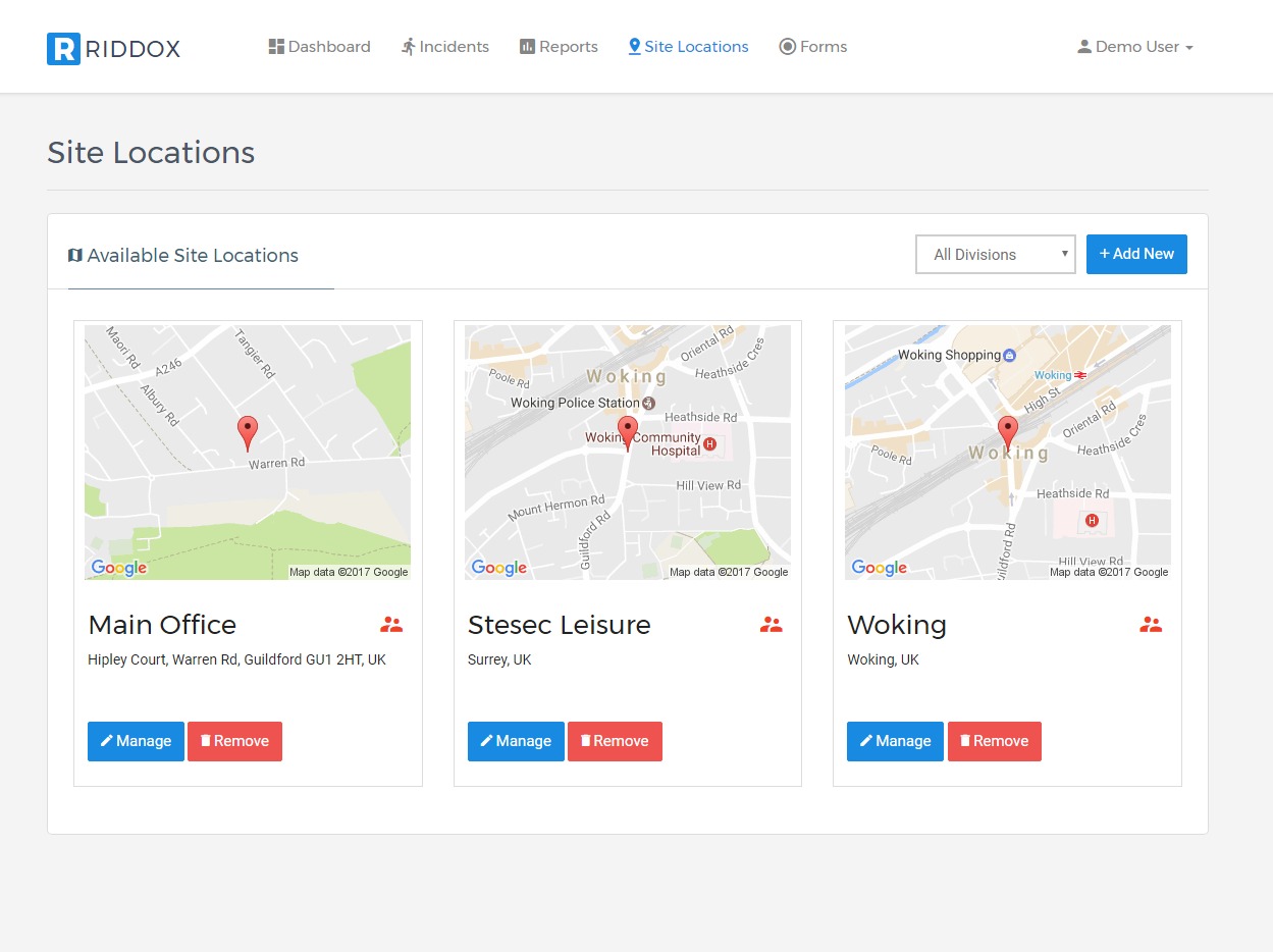 Have as many or as few potential incident locations within your sites. You can edit these accordingly at any time in “Site Locations” part of your Riddox.co.uk system.