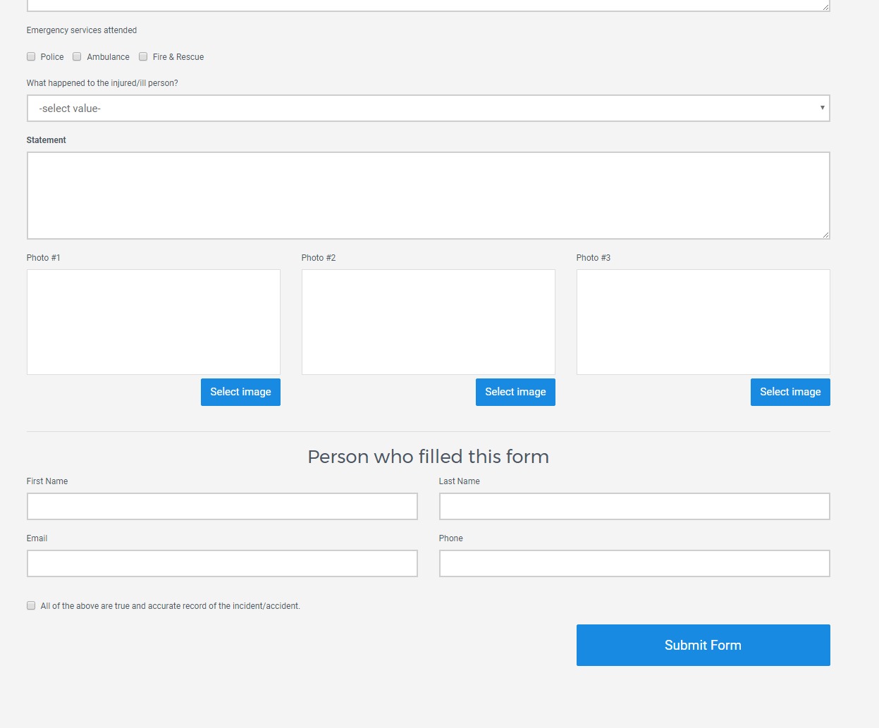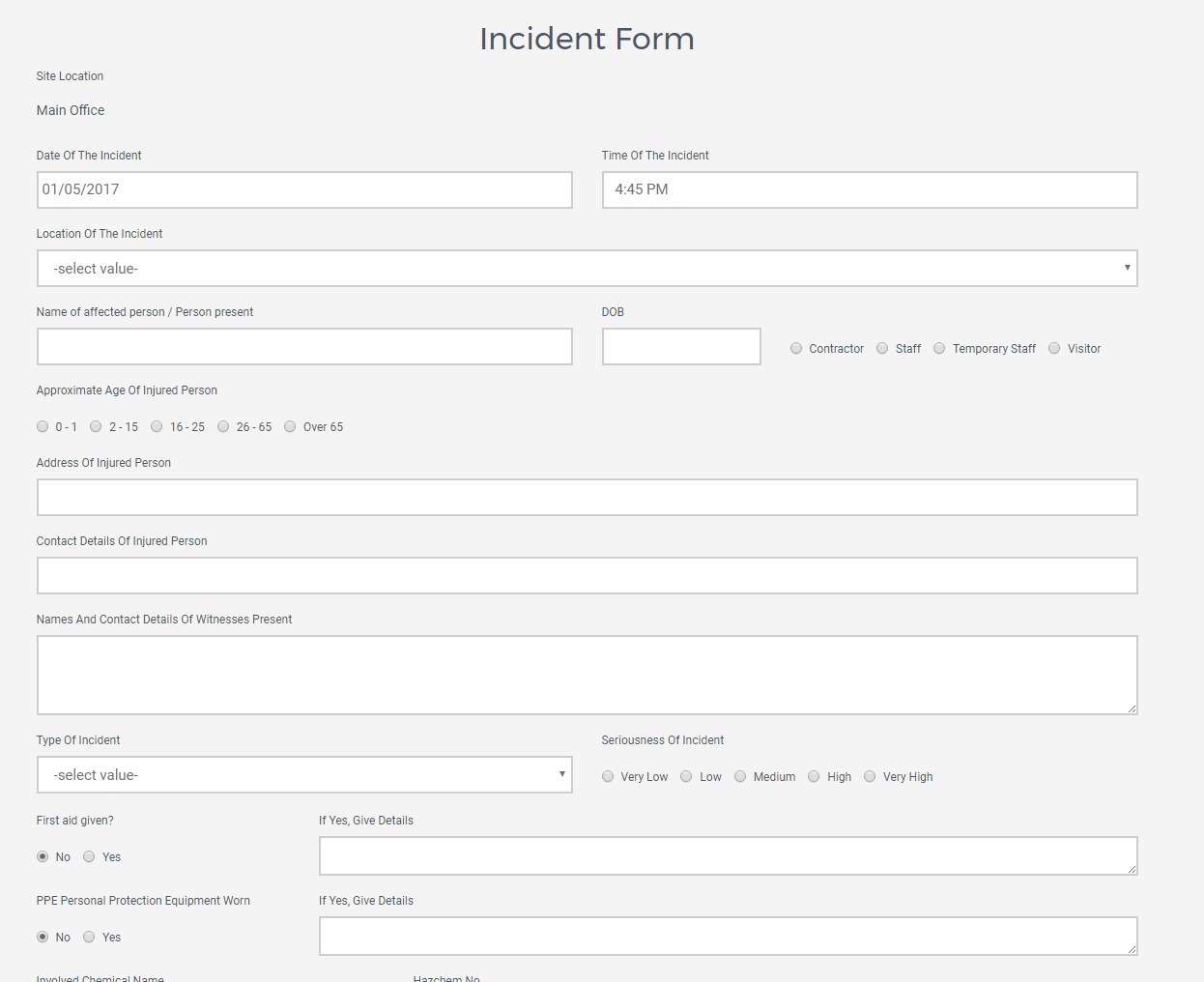 Certain fields of the incident form must be filled out in accordance with RIDDOR 2013. Without these details submission of the form would be unsuccessful. You will be able to choose which other details on the form are compulsory before the form submission.
