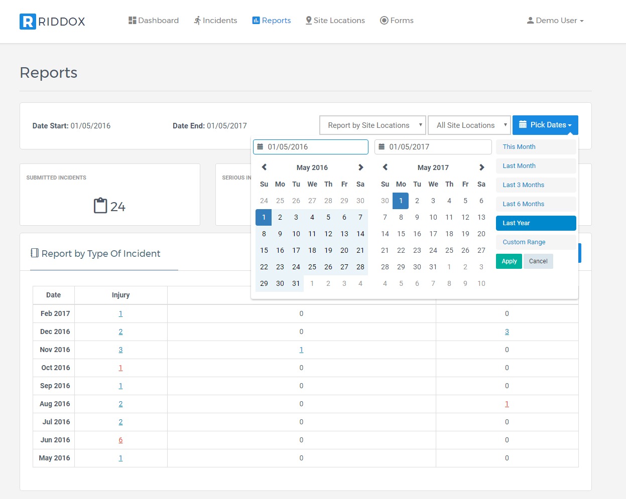 All incident reports, evaluations and analysis can be selected for time periods which are chosen by yourself. All of the reports are organised into various groups depending on the incident type and relevance.